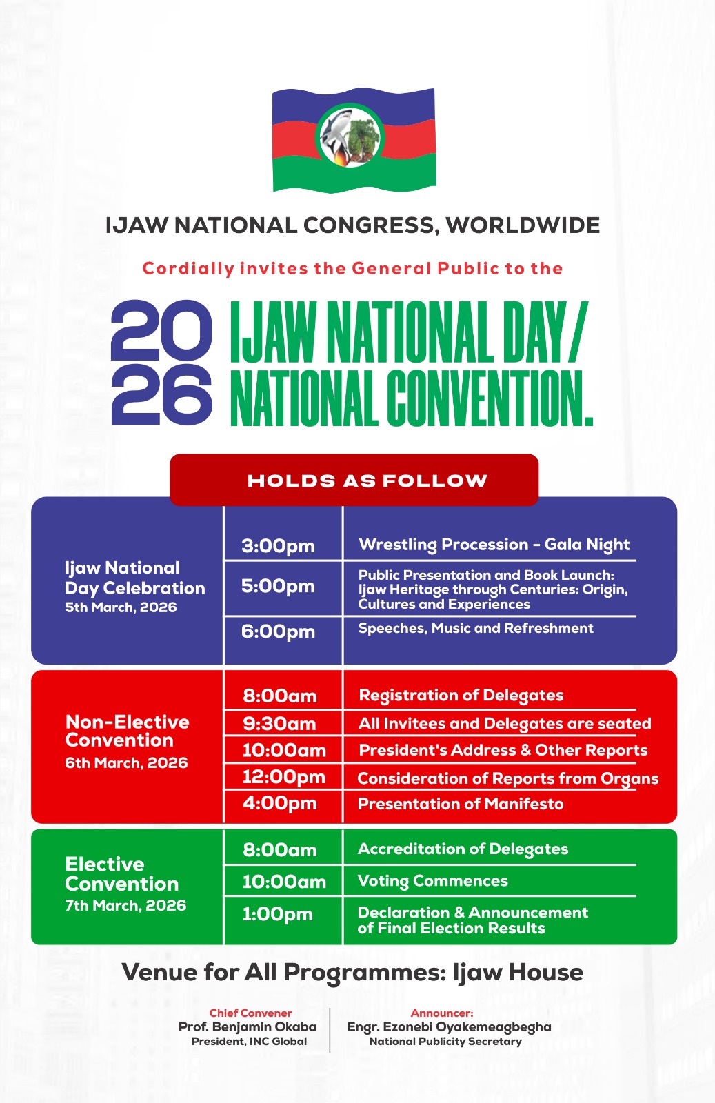 The Ijaw National Congress (INC) has invited the public, stakeholders, and delegates to its 2026 Ijaw National Day Celebration and National Convention, scheduled to take place from March 5th to 7th, 2026, at Ijaw House.
